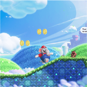 El juego destaca por su expresivo estilo de animación, lleno de personalidad en cada salto, y la introducción de transformaciones icónicas como Mario Elefante.