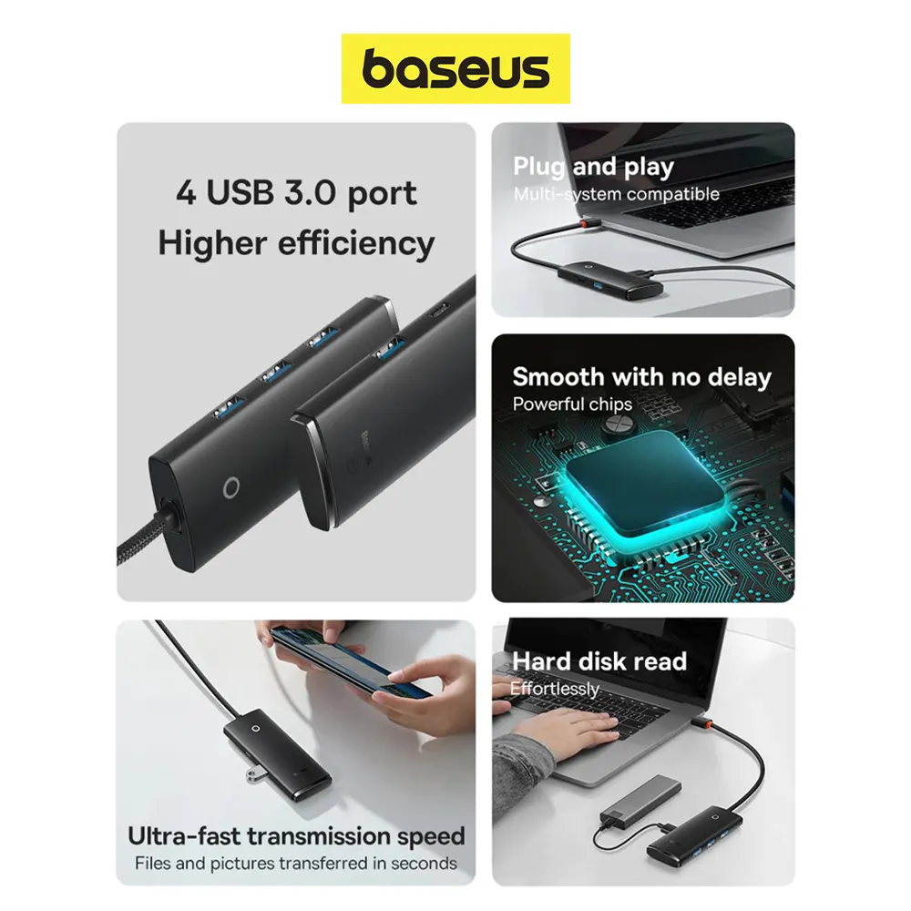 ✅ Adaptador BASEUS USB-C HUB 4 en 1 ✅ 4X Puerto de salida simultánea a la velocidad de la eficiencia de su trabajo ✅ Máximo 5Gbps de velocidad de transmisión rápida y estable ✅ Potente chip para más estable de la señal y suave operación ✅ Perfecto para unidades de disco duro ✅ La función OTG desbloquear la nueva función de teléfonos ✅ Conectar los teléfonos para unidades Flash USB/discos duros ✅ Plug and play para múltiples sistemas operativos, como Windows Apple OS Linux y Vista
