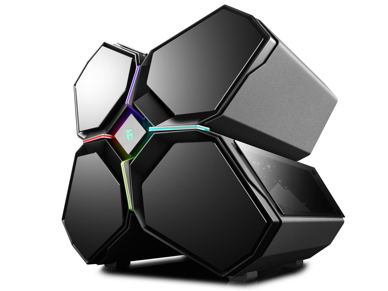 Cuatro tiras de luz LED RGB están integradas en el panel frontal que conducen al botón de encendido central, ofreciendo una forma futurista de encender el sistema.